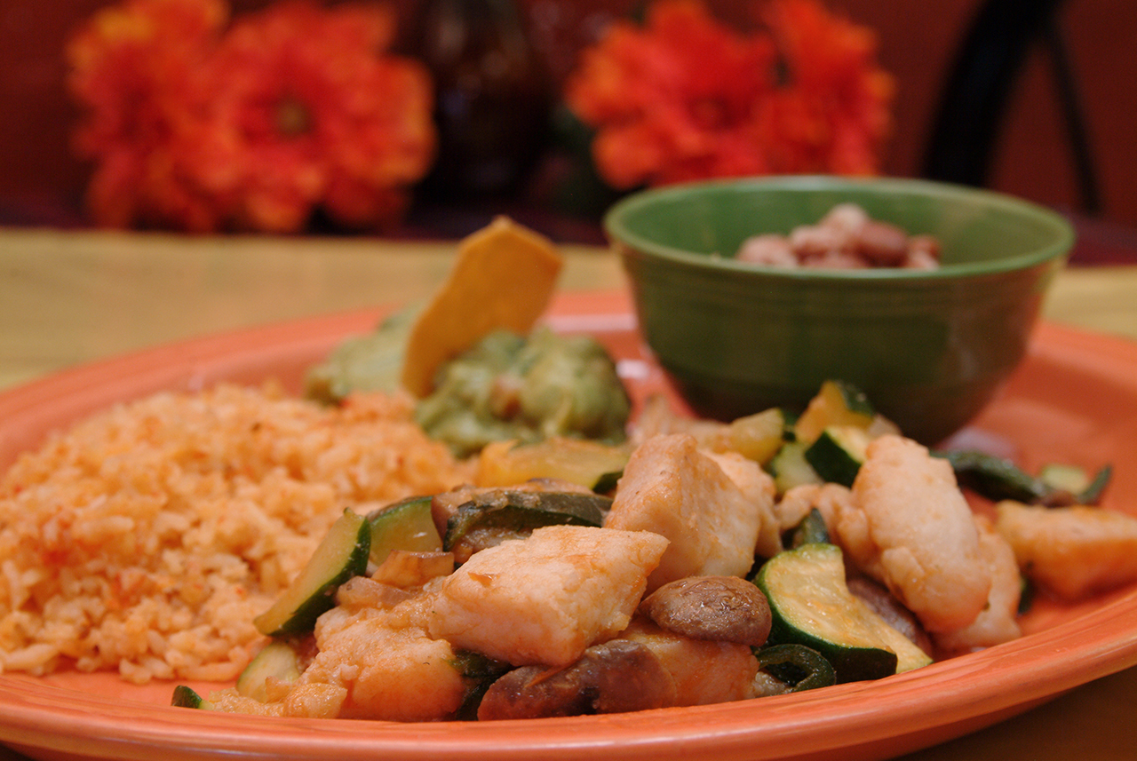 Pescado a la Mexicana: Grilled Fish with Grilled Veggies (plate includes rice, beans, guacamole & choice of corn or flour tortillas)